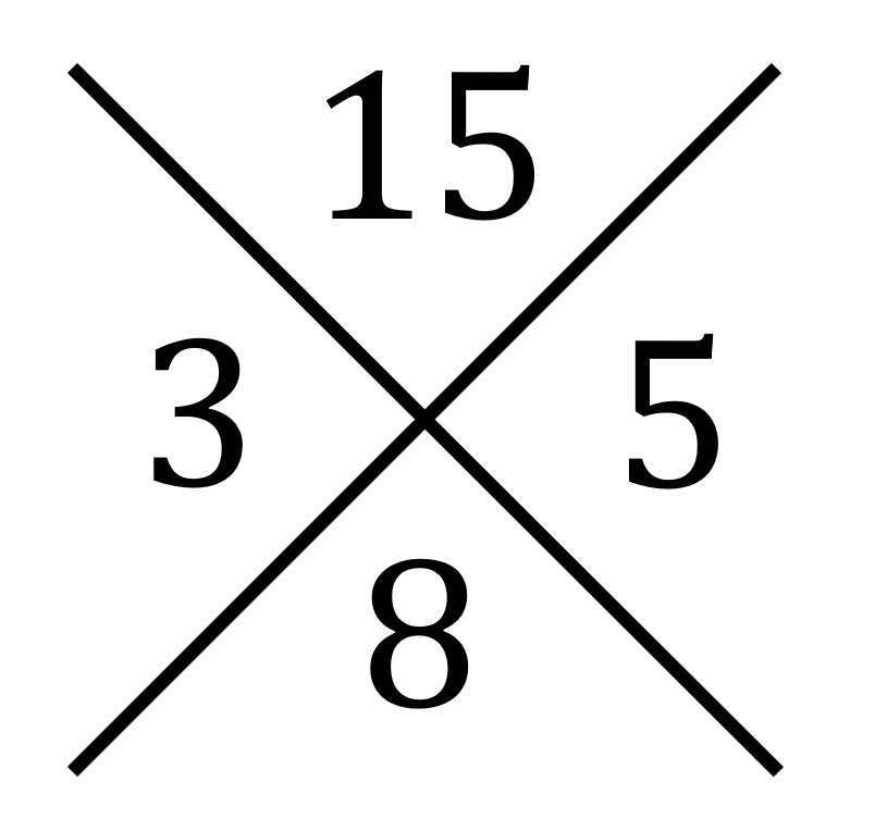 1. Think of any two integers (or fractions if you are feeling spicy). Draw an X on the board and write the product of the two numbers in the top space and the sum of the two numbers in the bottom space. For example, if I’m thinking of the numbers 3 and 5, I would draw this: