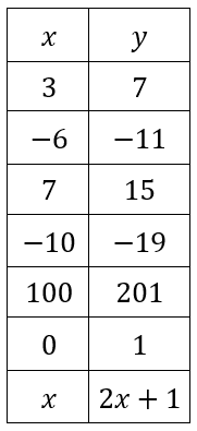 3. Give students some time to consider the pattern. If a student thinks they know the pattern being used, have them raise their hand. After a few hands are up (hopefully), call on one student and give them another x-value in the table and have them mentally compute the correct output. They are not explaining the pattern out loud, but simply giving the numerical output for the given input. If no students raise their hands at all, fill in another row with new values to give them more to think about.