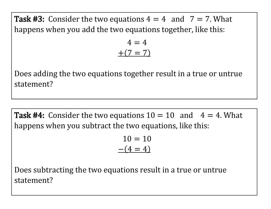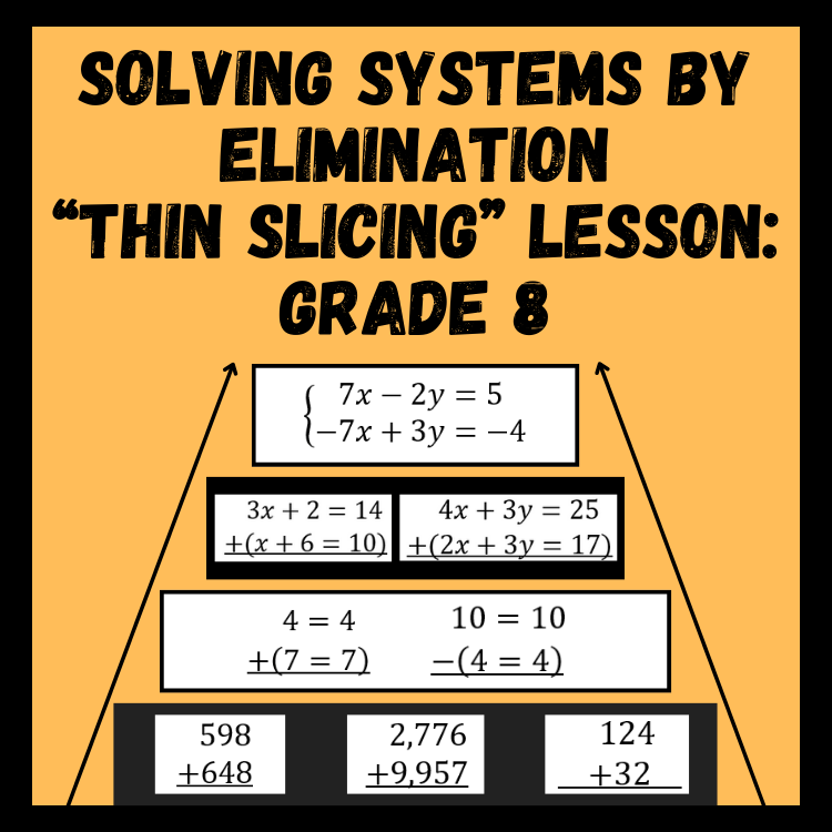 When designing a new thin slicing lesson I always ask myself what the simplest possible skill is that students need to gain entry into the topic. I can never really go low enough. Students with low math confidence can still start the lesson and build up, rather than hitting a wall on Task #1. Students with higher confidence can devour the beginning tasks, but eventually get to a challenging problem and slow down. Here’s an example of a lesson I created for solving systems by elimination: