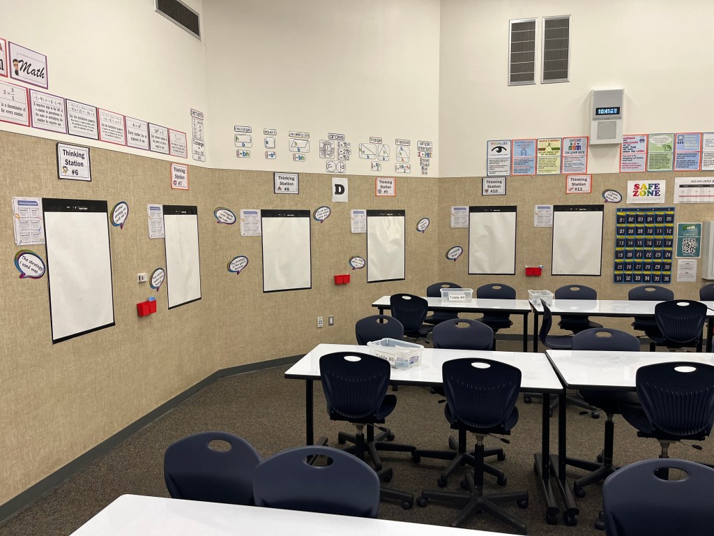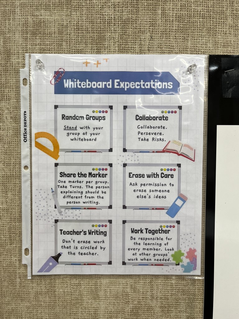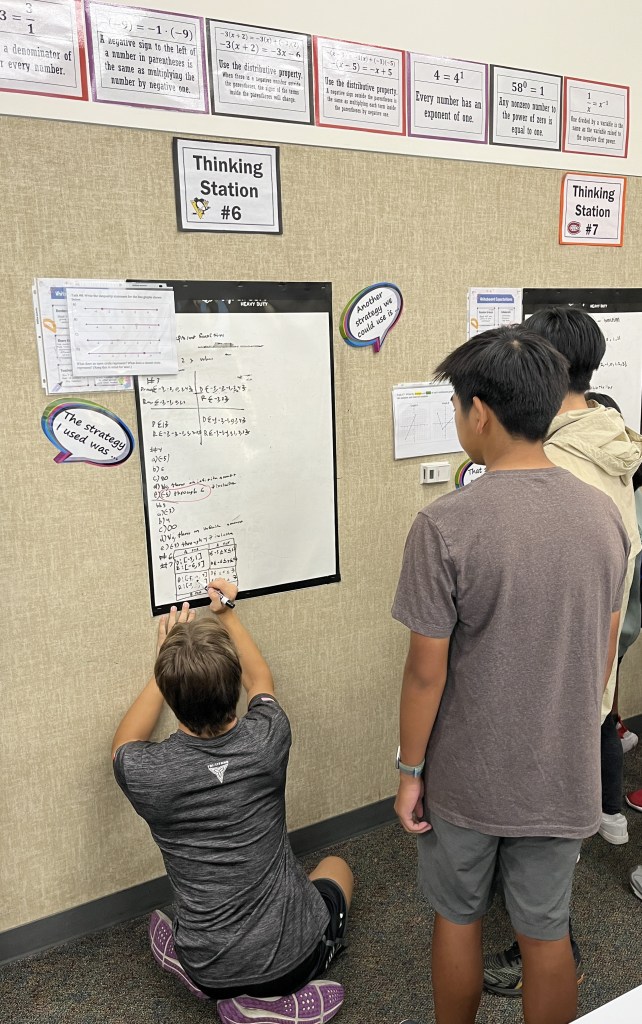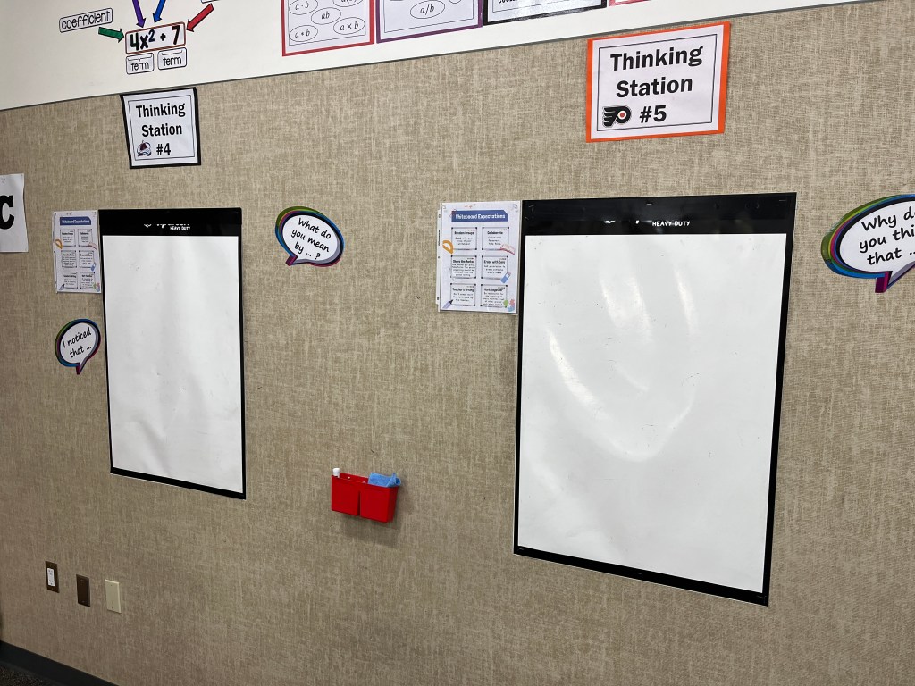 I think my favorite thing about the students working on vertical surfaces is that I can scan the whole room in under 30 seconds and find which groups need assistance, who needs redirecting, and which groups might be ready for an extension problem. Getting that same information when everyone is seated is much more challenging.